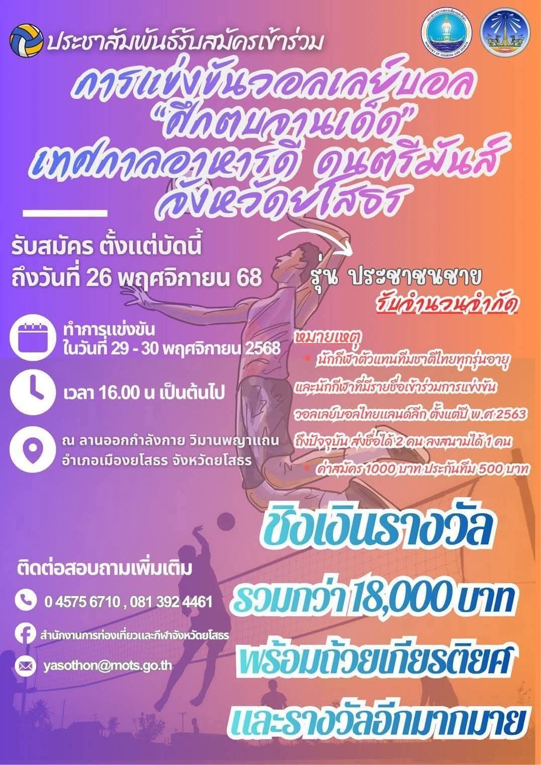 ขอเชิญสมัครเข้าร่วมการแข่งขันวอลเลย์บอล “ศึกตบจานเด็ด เทศกาลอาหารดี ดนตรีมันส์” จังหวัดยโสธร ![]()