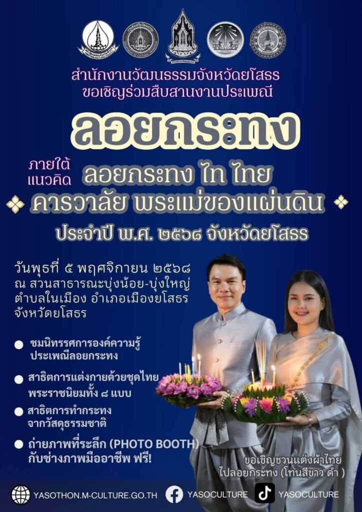 สำนักงานวัฒนธรรมจังหวัดยโสธร ขอเชิญร่วมสืบสานงานประเพณีลอยกระทง ภายใต้แนวคิด “ลอยกระทง ไท ไทย คารวาลัย พระแม่ของแผ่นดิน” ประจำปี พ.ศ. ๒๕๖๘ จังหวัดยโสธร